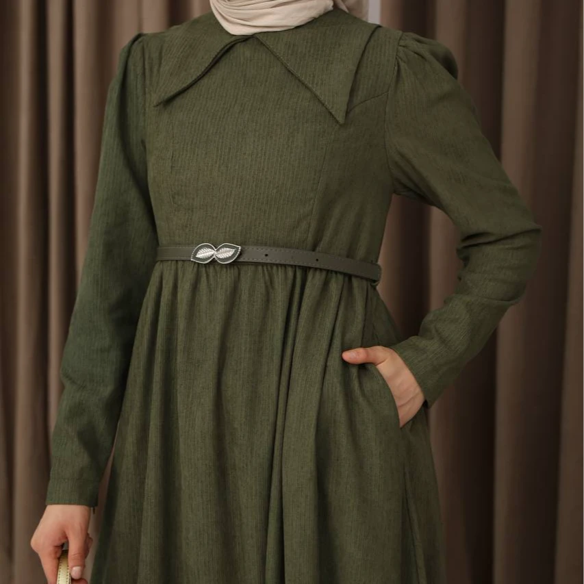 فستان فضاض واسع مع اكمام منفوخة بأزرار عند الصدر
